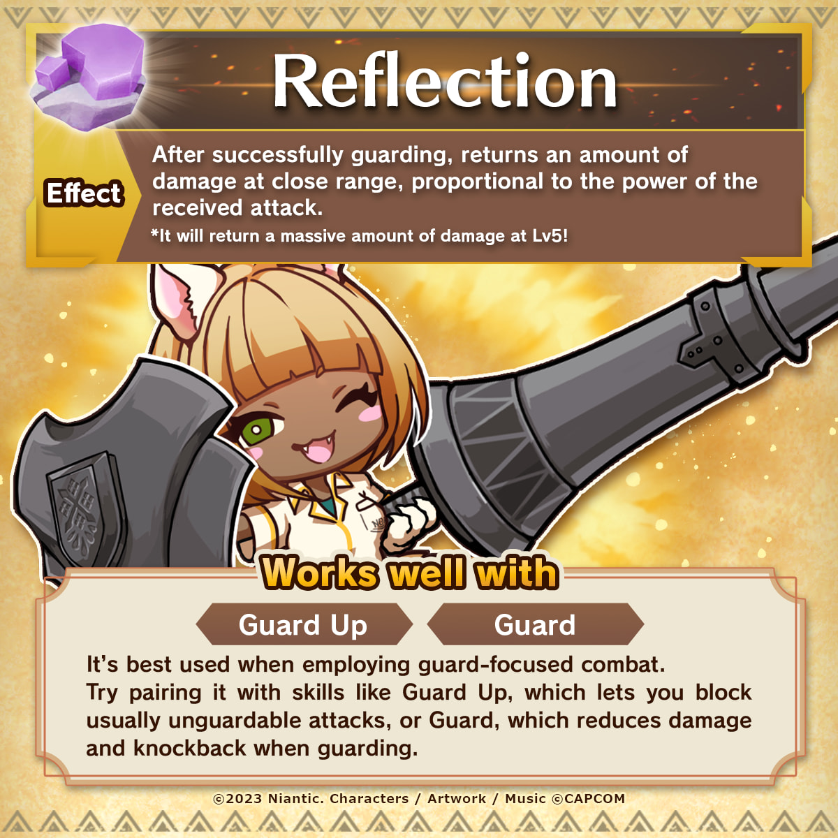Augmente l'affinité et le remplissage de la jauge spéciale lorsque les conditions sont remplies durant une chasse. |