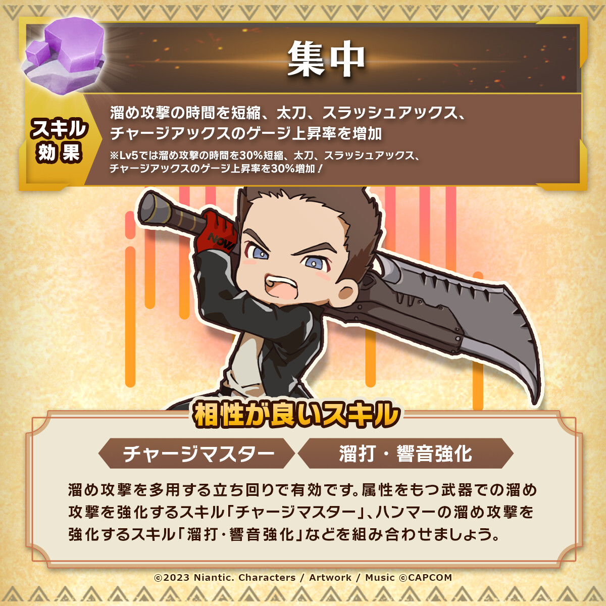 集中 | 溜め攻撃の時間を短縮、太刀、スラッシュアックス、チャージアックスのゲージ上昇率を増加 |
