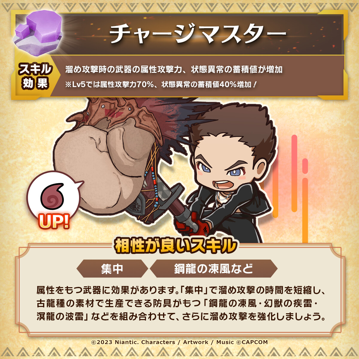 チャージマスター | 溜め攻撃時の武器の属性攻撃力、状態異常の蓄積値が増加 |