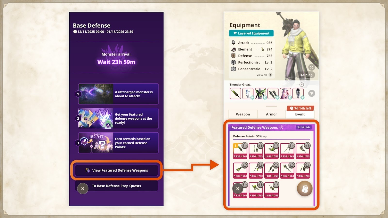 拠点要撃戦準備クエストや大量出現イベントに参加することで、要撃特選武器の生産・強化を効率的に進めることができます。