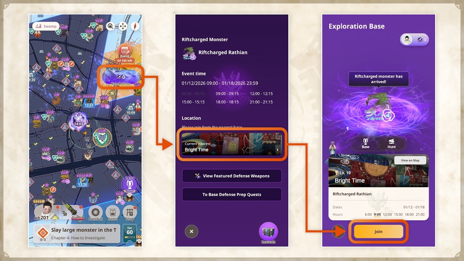 近くの探索拠点から参加できます(メイン画面の右下に表示される「探索拠点」ボタンをタップするか、メイン画面右上の「拠点要撃戦」ボタンから、拠点要撃戦画面へ移動し最寄りの探索拠点のバナーをタップすることで近くの探索拠点を確認できます)。
