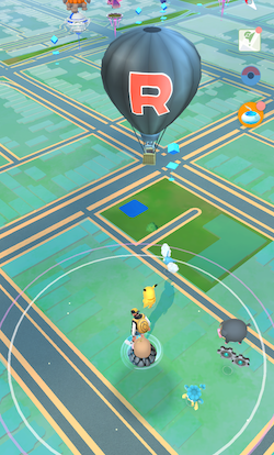 GOロケット団の気球がマップ上空に浮かび、バトルを挑めるGOロケット団員が乗っています。 マップで自分のトレーナーの姿付近に丸い影が見えたら、ズームアウトして見回し、浮かんでいるGOロケット団の気球を見つけてください。