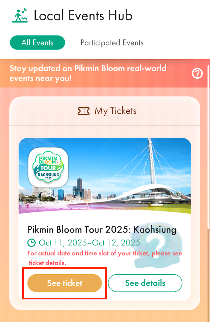 Tap “Pikmin Bloom Tour 2025: Kaohsiung,” scroll down to check the date of your ticket.
