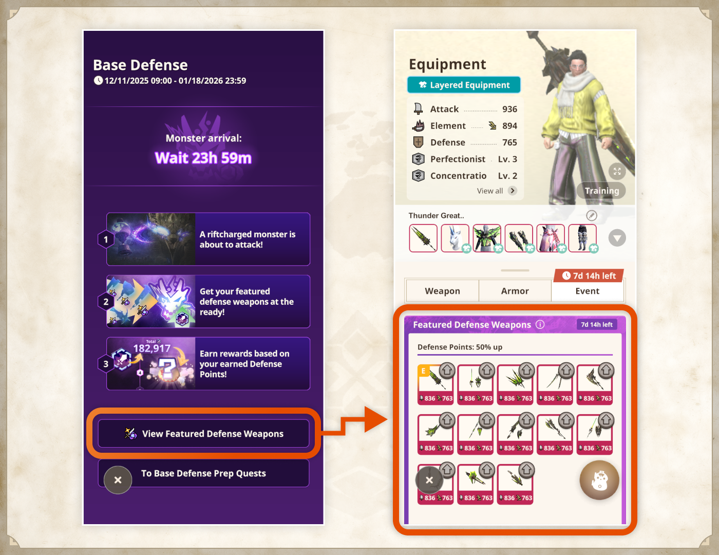 Forjar e melhorar as Armas de Defesa em Destaque pode ficar mais eficiente se você cumprir a Missão de Preparativos da Defesa da Base e participar de Deflagrações de Monstros.