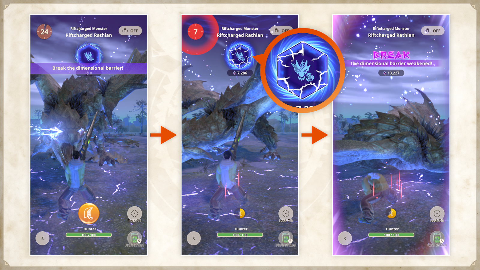 É possível enfraquecer a Barreira Dimensional ao atacar continuamente, mas ela se restaurará após um determinado tempo.