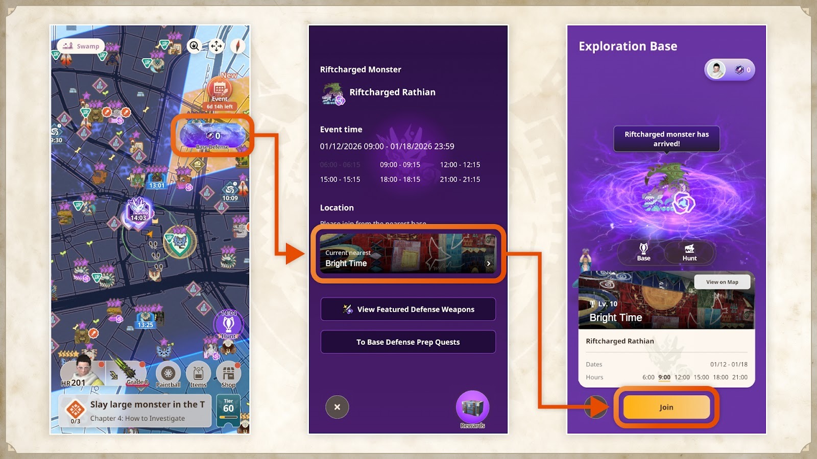 可從鄰近的探索據點參加(點擊顯示於主畫面右下方的「探索據點」按鈕或主畫面右上方的「據點迎擊戰」按鈕,移動至據點迎擊戰畫面,並透過點擊最近的探索據點的橫幅,便能查看附近的探索據點)。